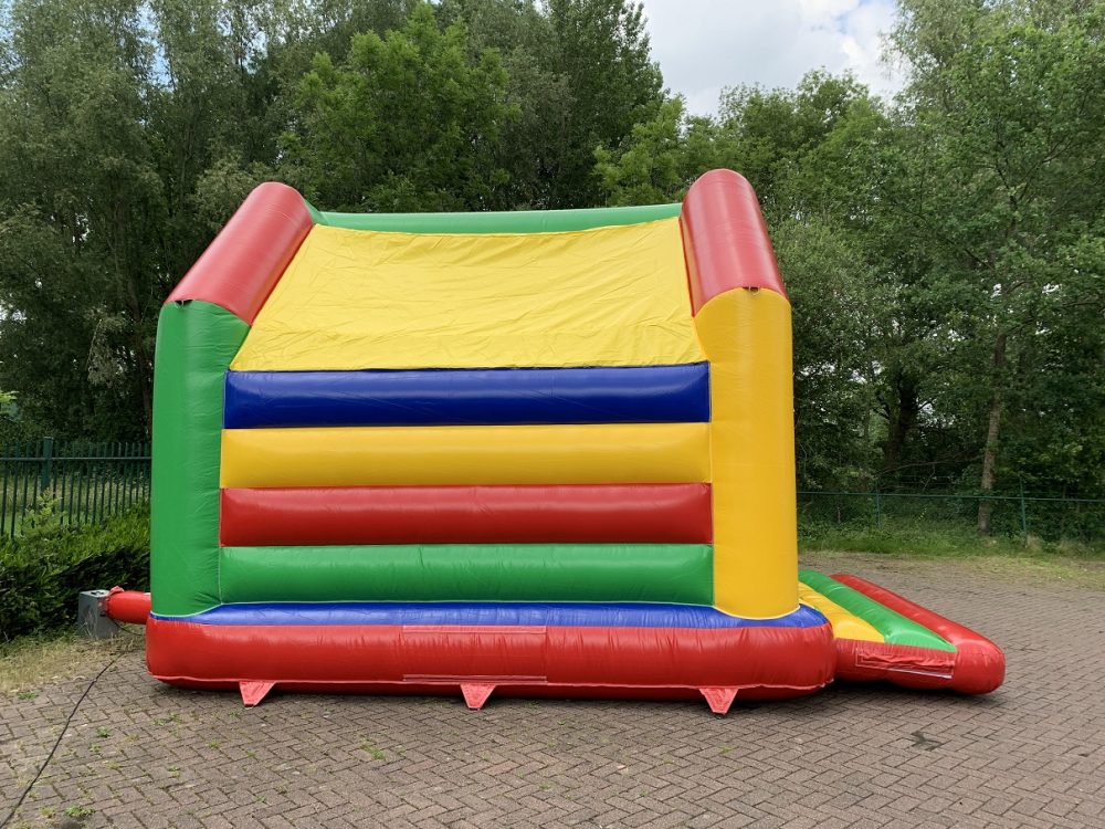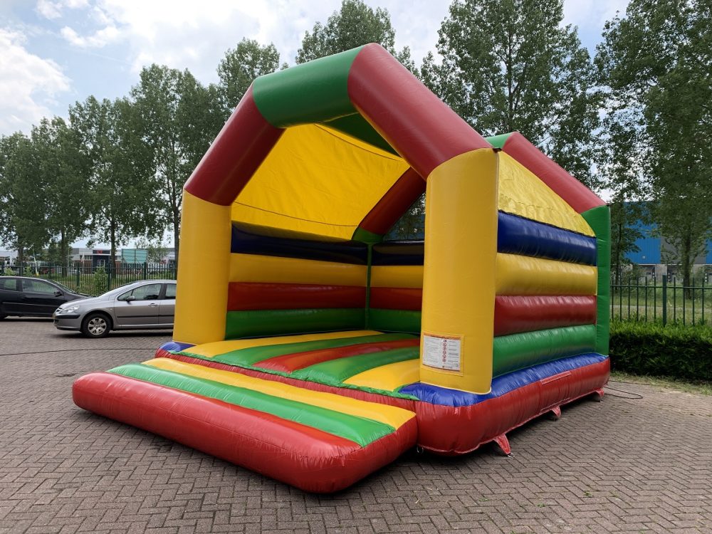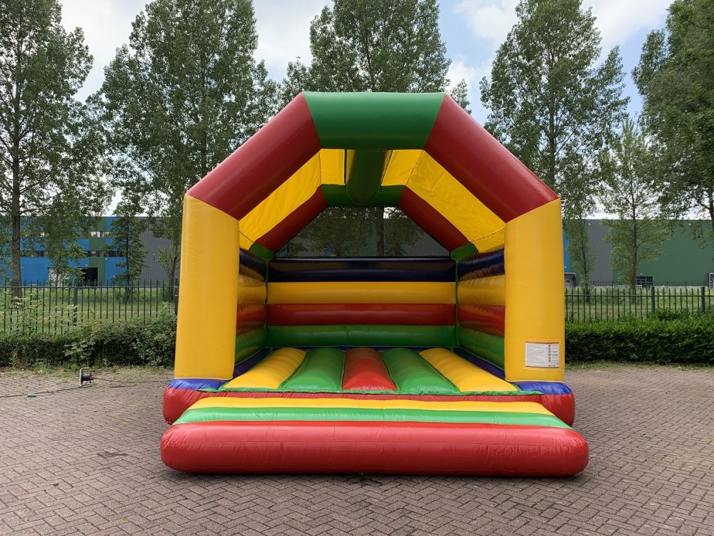 Castillo aroiris con techo con colores super divertidos. El techo protege contra el sol y la lluvia. Se puede usar este Castillo Hinchable todo el año.